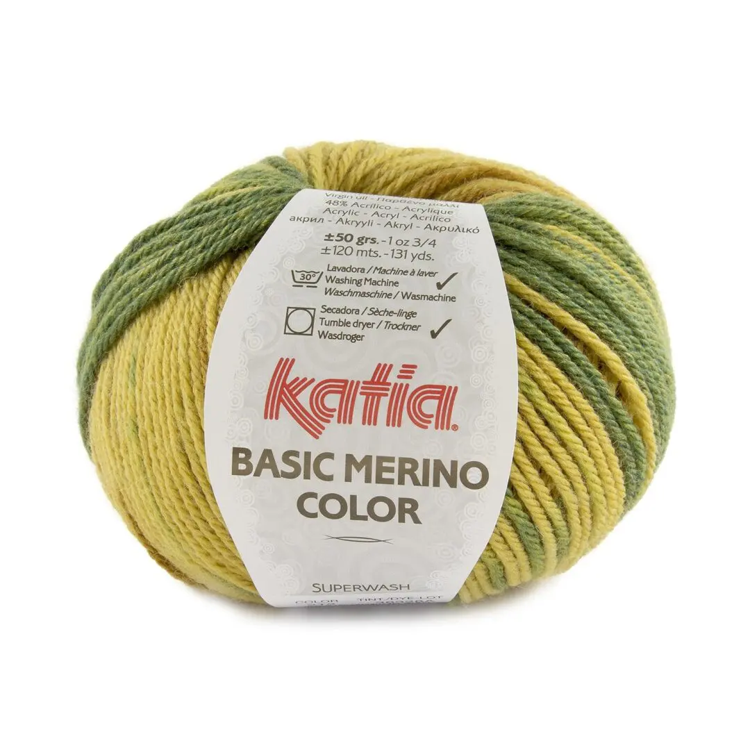 Katia Basic Merino Color – is een heerlijke basiswol met een unieke kleurenprint dankzij de mengeling van afzonderlijk geverfde wolvezel en acryl. Brei veelzijdige en elegante dameskleding, charmante meisjesjasjes en comfortabele jongenstruien. Combineer dit originele veelkeurige garen met de solide kleuren van Basic Merino voor geweldige resultaten.